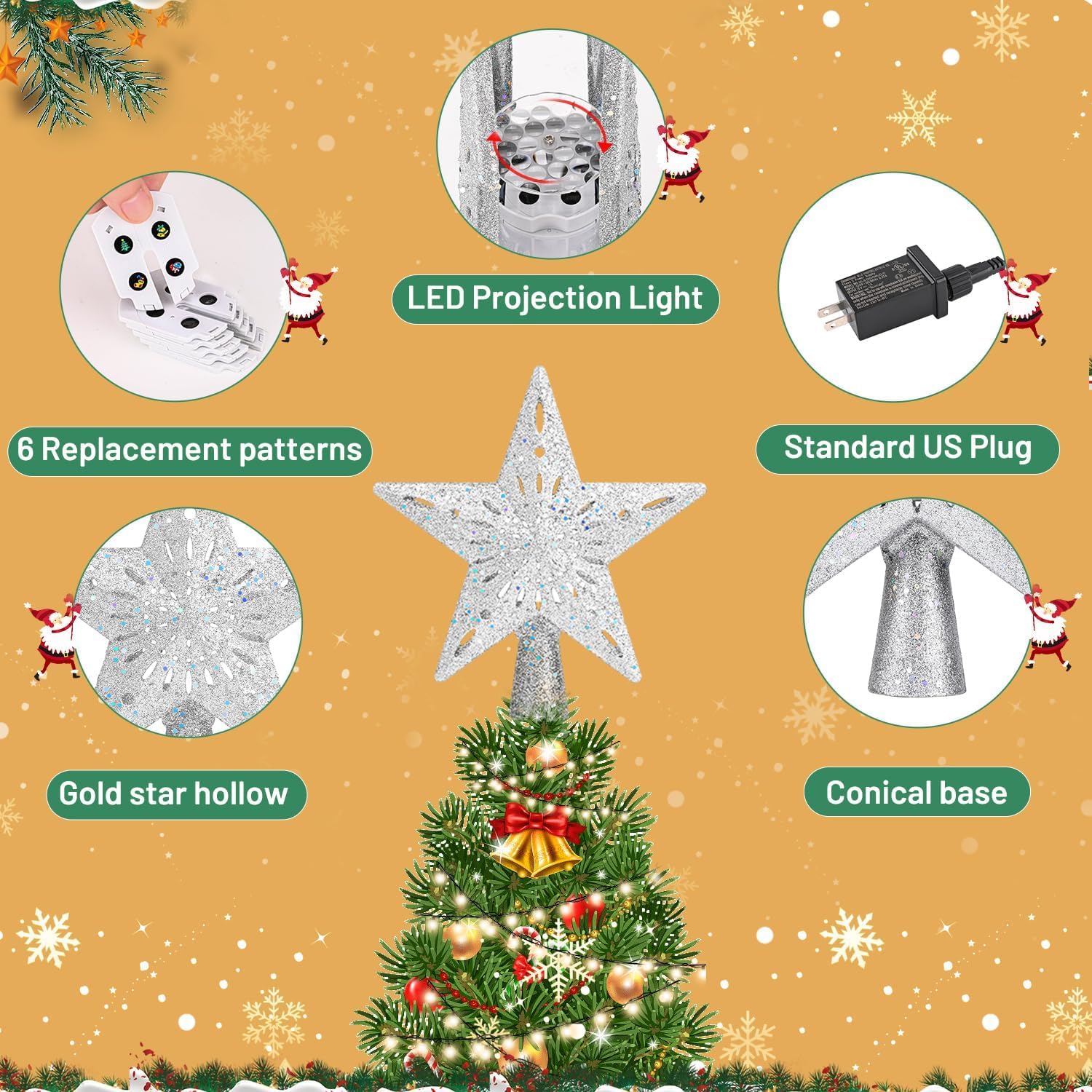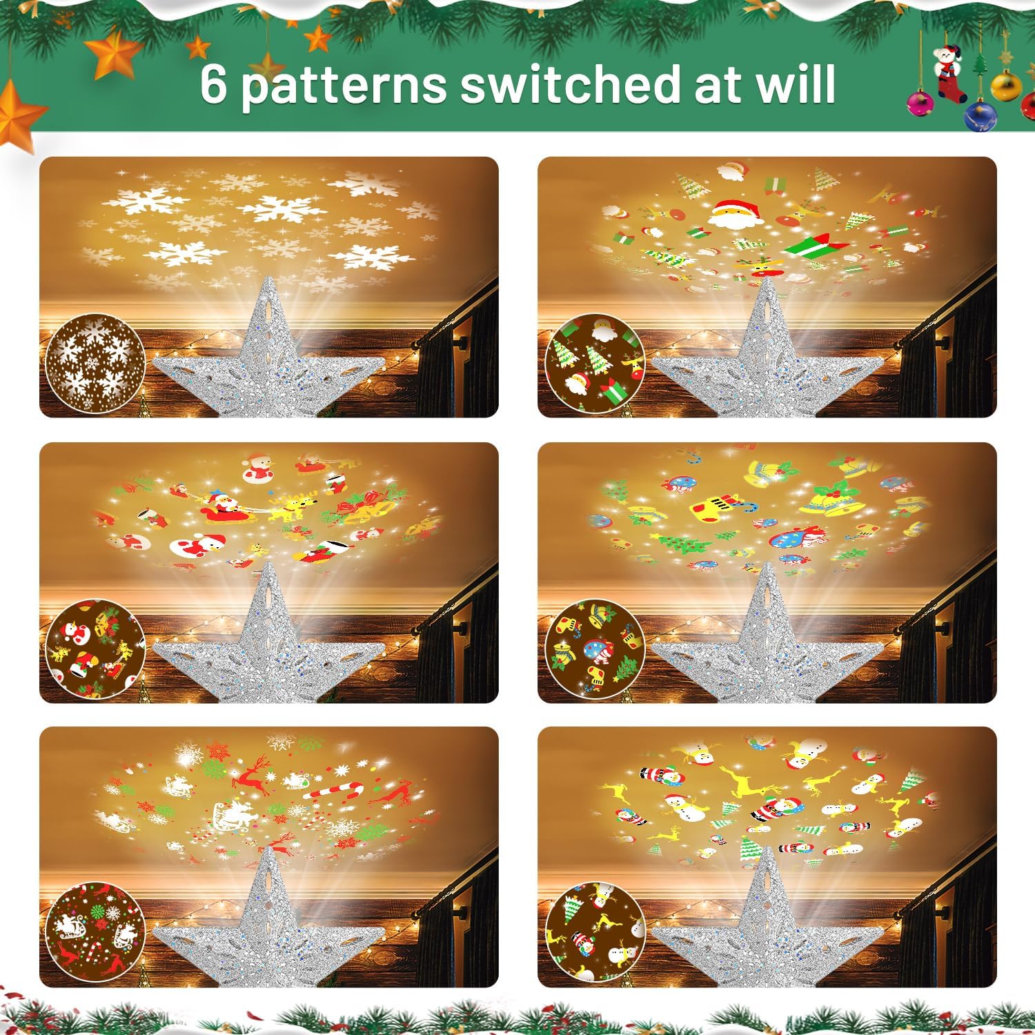 - [6 Dynamic Projection Modes]: 3D Christmas tree topper lighted has 6 pattern cards with different lighting effects,6 LED projection patterns: Christmas tree, Santa Claus, snowflakes, Christmas stockings, elk, and snowman, presenting a strong Christmas atmosphere.